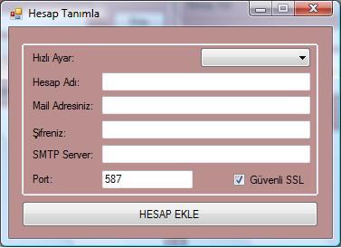 Birde ‘Hızlı Ayar’ kısmı var, burada eğer hotmail, gmail veya yahoo mail hesabını ekleyecekse ve kullanıcı smtp server adresini bilmiyorsa otomatik olarak yazılıyor. Hesap Ekle butonunda yapılacak görevler;